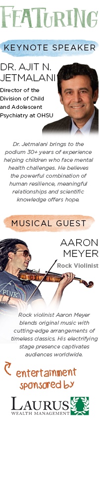 Enjoy a catered dinner buffet by Kitchen Goddess and a keynote address by OHSU's esteemed Director of the Division of Child & Adolescent Psychiatry, Dr. Ajit Jetmalani. Entertainment provided by rock violinist Aaron Meyer.